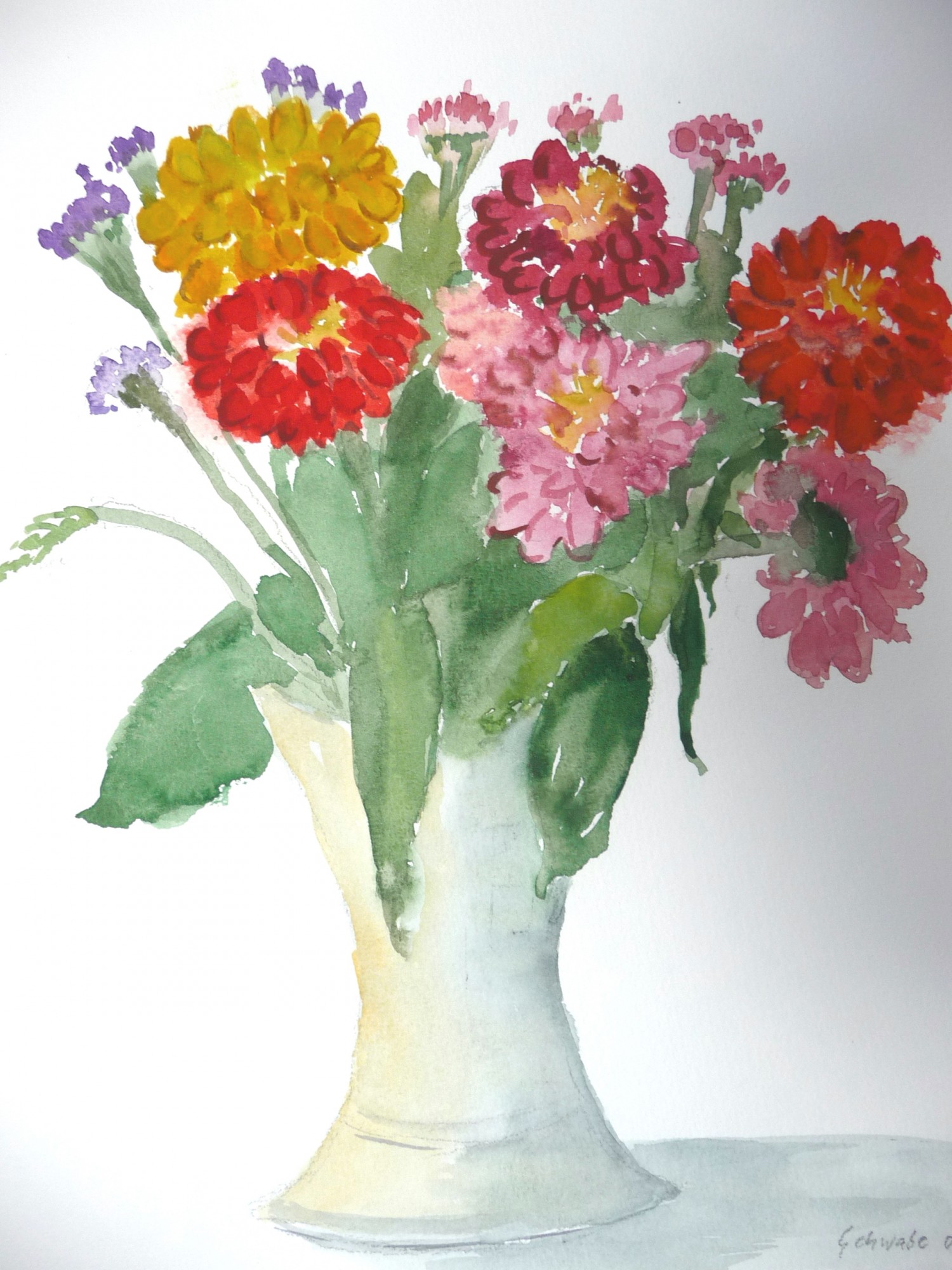 Blumen Für eine vergrößerte Ansicht der Bilder klicken Sie auf das jeweilige Bild Flieder (1951) Tränende Herzen (1952) Uferpflanzen (1973) Gladiolen (1975) Sonnenblumen (Gouache) (1982) Königskerze ((1982) Stiefmütterchen (1983) Blumen I (1997) Blumen II Zinnien (2009)